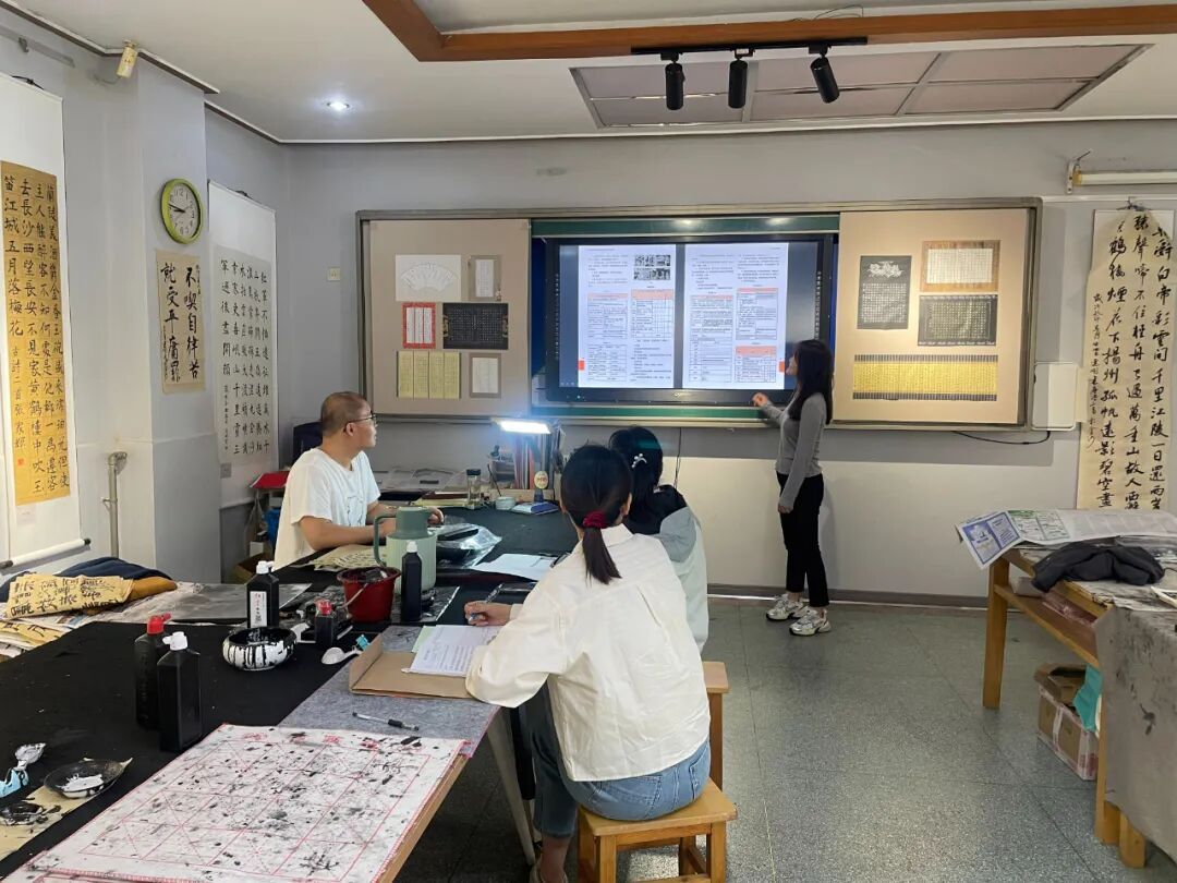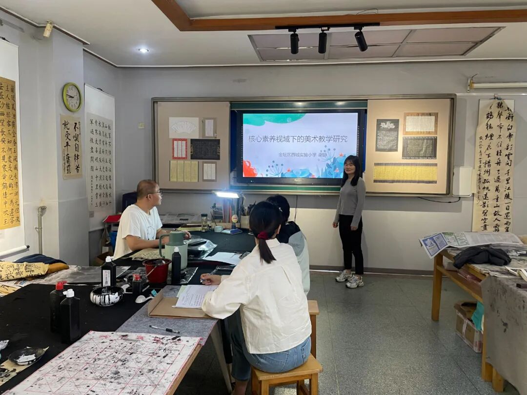 接着,第二节课谢静老师在书法室带来理论学习《核心素养视域下的美术教学研究》。当前,美术教学普遍存在着学生学习积极性不高、思维固化、被动学习等问题。为了更好地解决这些问题,教师可以通过项目式教学构建更加开放的教学模式,激发学生的学习潜力。项目式教学以学生为中心,兼具探究性和个性化教学,是教师与学生共同开展的一种基于任务情境的教学模式。教师可通过确定项目主题、确立核心任务、情境创设、设计教学活动、全面评价和反思延伸等方式组织教学,以此在课堂中更加有效地培养学生的美术核心素养。